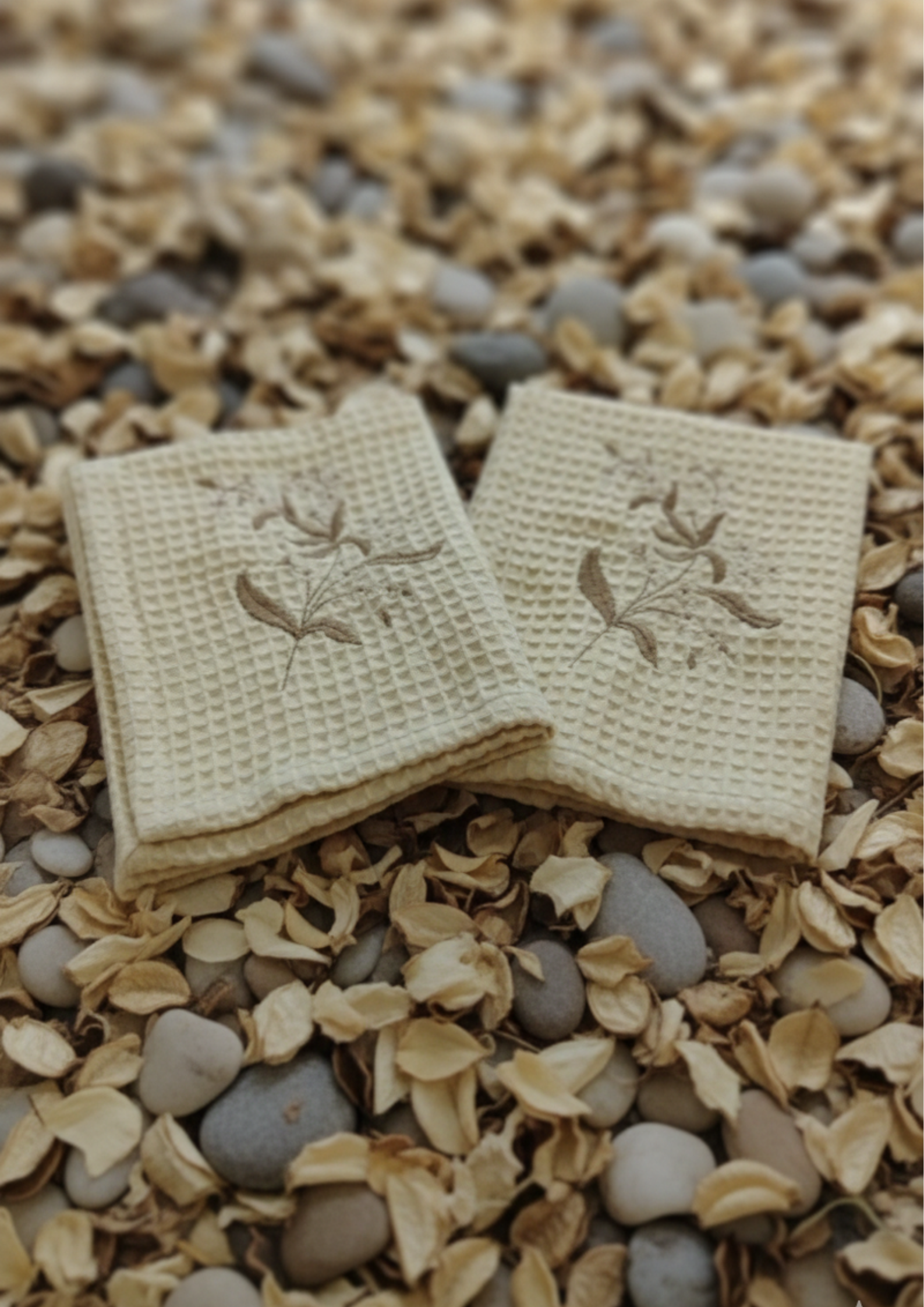Bring understated elegance to your home with our Sereine Botanica Waffle Hand Towels. Crafted from premium cotton waffle fabric in a soft ecru hue, these towels are adorned with delicate botanical embroidery that adds a subtle, nature-inspired charm.