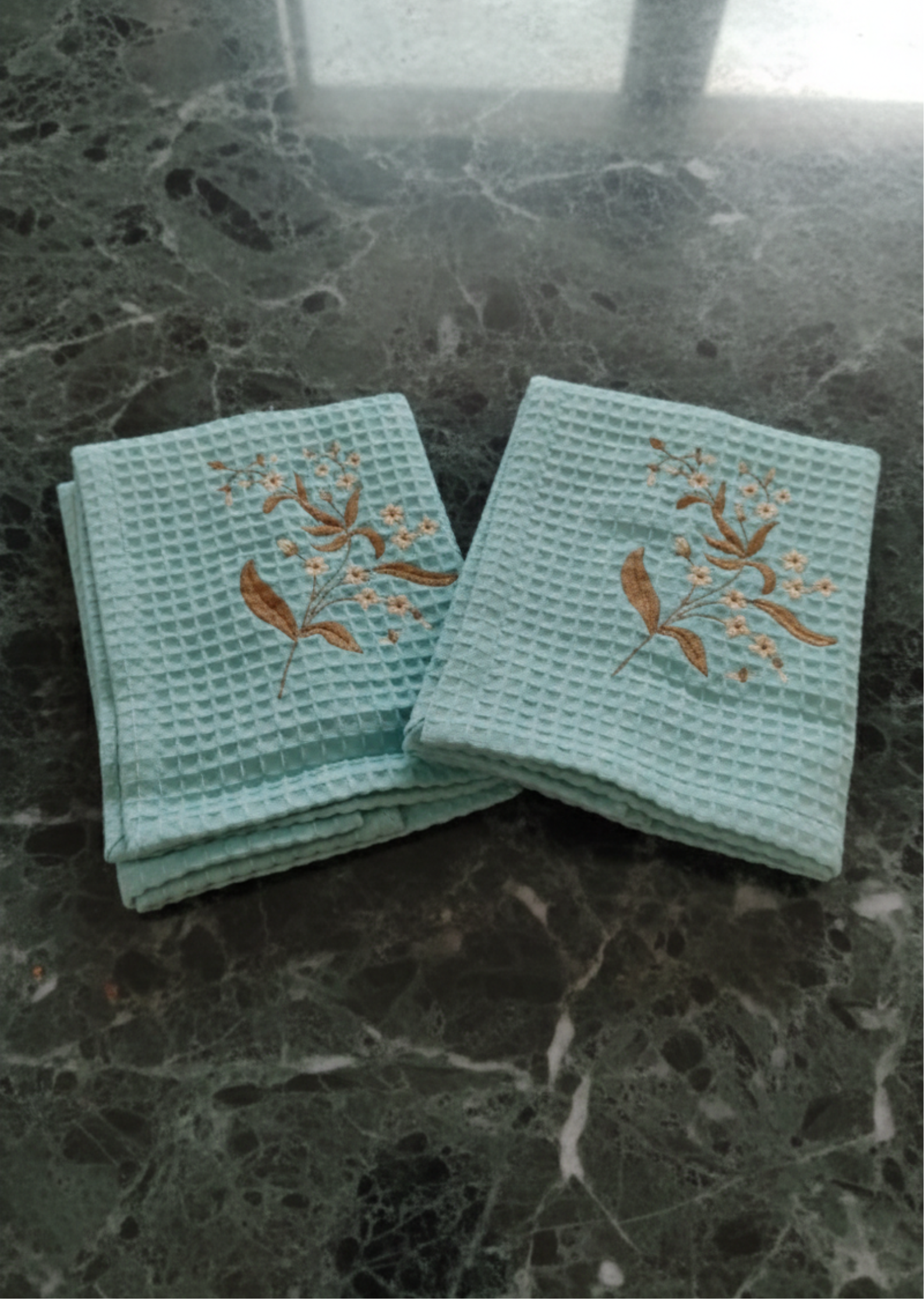 Add a touch of elegance to your everyday essentials with our Aqua Bloom Embroidered Waffle Hand Towels Set. Crafted from soft, absorbent waffle-textured cotton, these towels are lightweight, quick-drying, and gentle on the skin. The delicate floral embroidery adds a refined, artisanal charm—perfect for elevating your bathroom or kitchen décor.